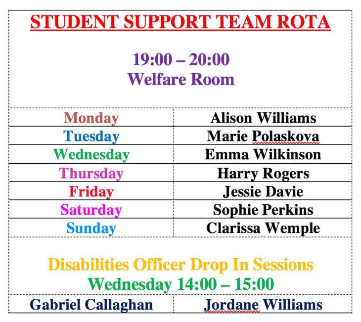 Can find me either in physics lab or in the Billy B, but Jordane and I have a drop in shift between 2-3pm on Wednesday afternoons in the welfare room.