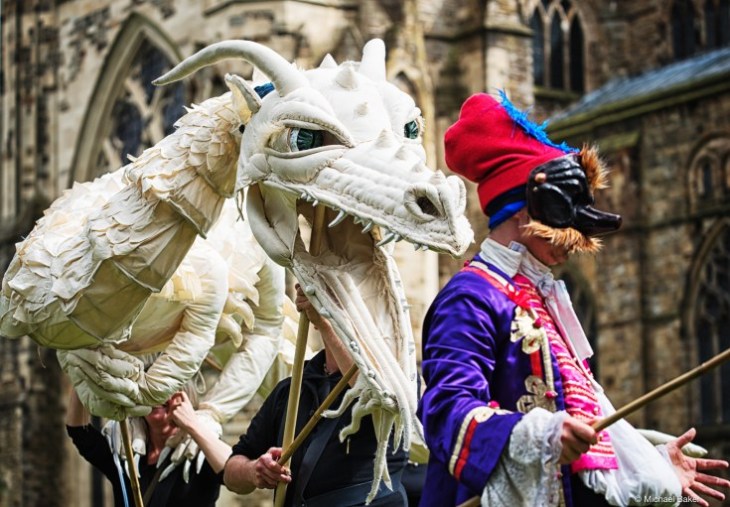 The first performance involved a dragon and three puppeteers. The dragon was based upon a 400 year old mythological beast allegedly stemming from Ethiopia. The dragon is said to have embarked upon a quest to Durham and its antics are the preface of the play. This particular model was a medieval stage dragon resembling a serpent that was recreated for the Theatrum Mundi show by the same company in 2016.