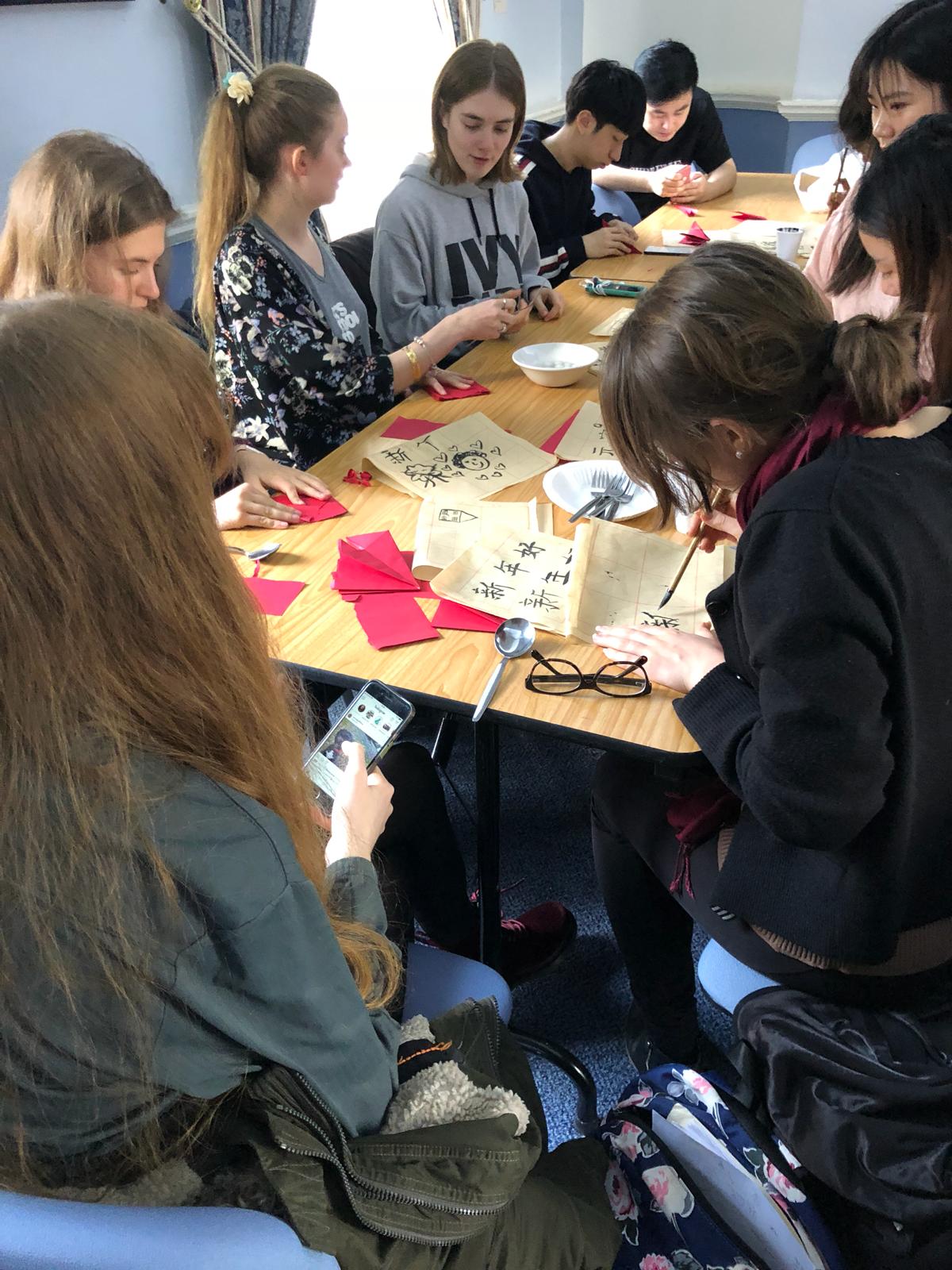 During the celebrations here at John’s, we had some good fun preparing and tasting quite a lot of delicious dumplings- the tradition says that the more dumplings you eat the wealthier you will be in the New Year! We then practised some calligraphy with traditional brushes and ink and we learnt how to write our names in Chinese. Then, with just some red paper we practised paper cutting and were able to realise amazing paper animals and objects of any kind and size!
