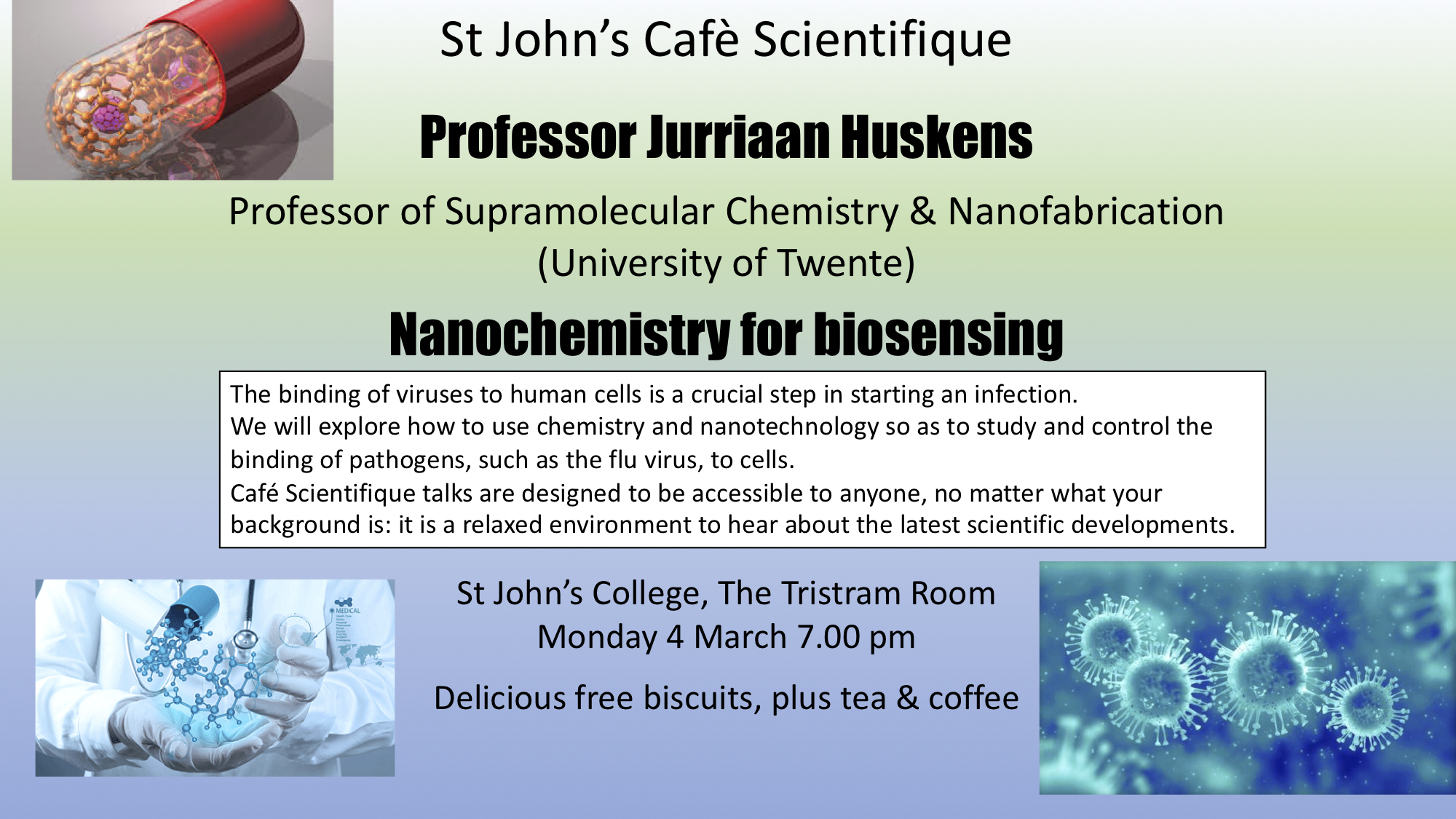 On the 4 March 2019, St John’s had the great pleasure of listening to a talk delivered by one of the most renowned leading international scientists in the field of nanotechnology: Jurriaan Husken, Professor of Supramolecular Chemistry & Nanofabrication Molecular Nanofabrication group (University of Twente). The talk was highly interdisciplinary given the background and current interests of Professor Huskens who studied as a chemist and is now applying nanotechnology to the biomedical field.