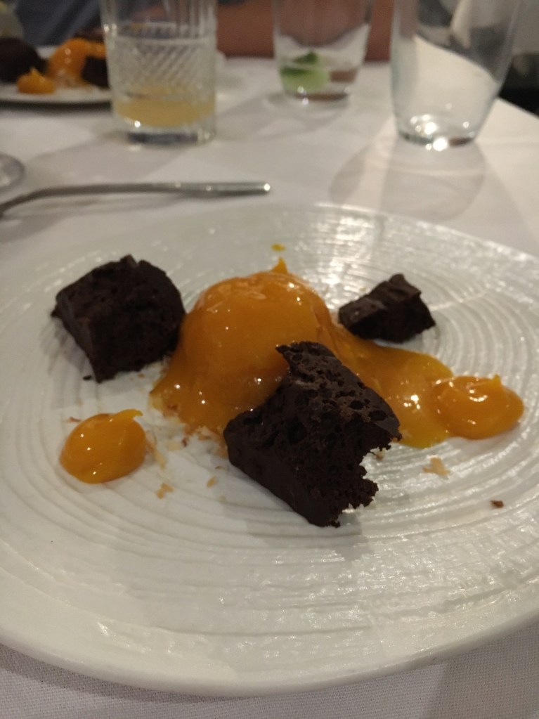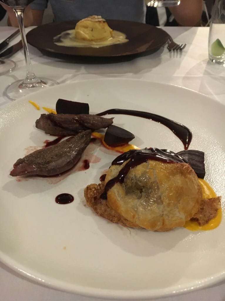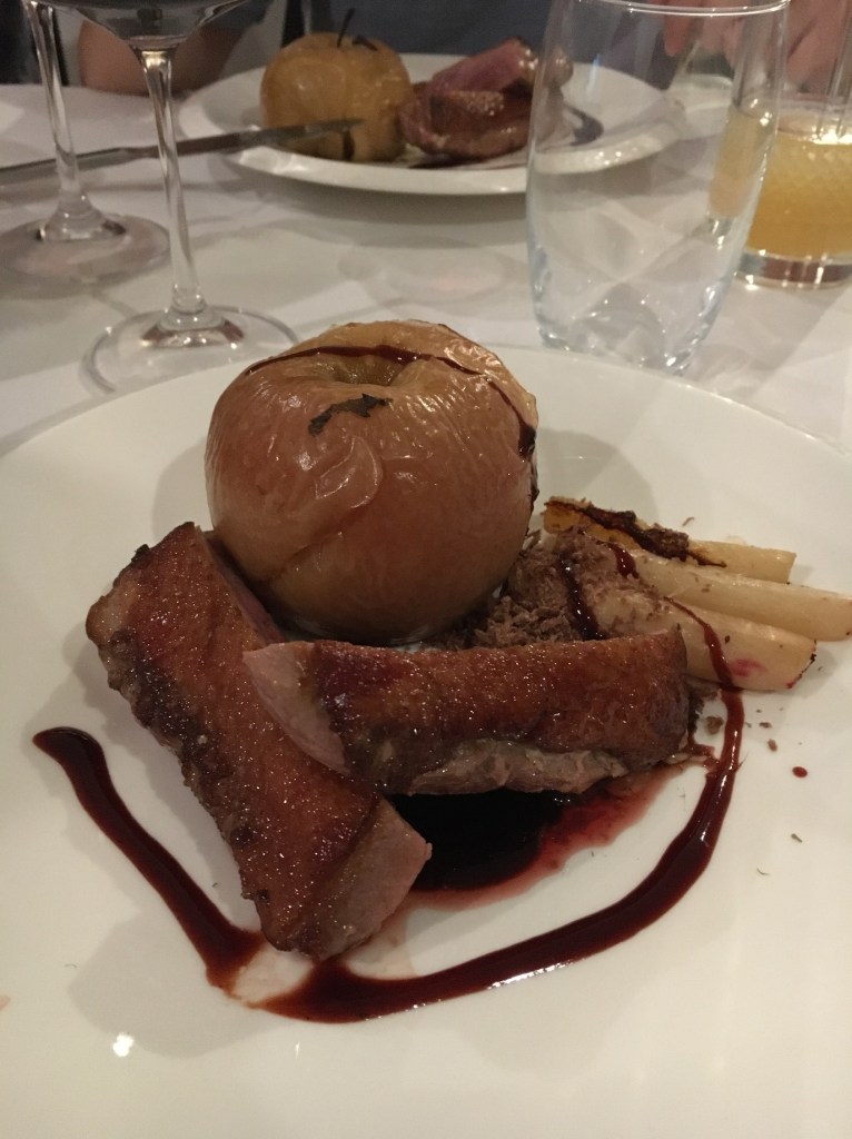For starter, I had a perfectly cooked pigeon breast, with a pigeon pithivier (a small pie) which was warm and comforting, and two indiscernible gel-like sauces: a purple one and an orange one. This was followed by succulent duck breast, which was served with a roasted whole apple that was so imposing it felt like a rude gesture, a confit duck leg, honey-glazed salsify and juniper goose shavings.