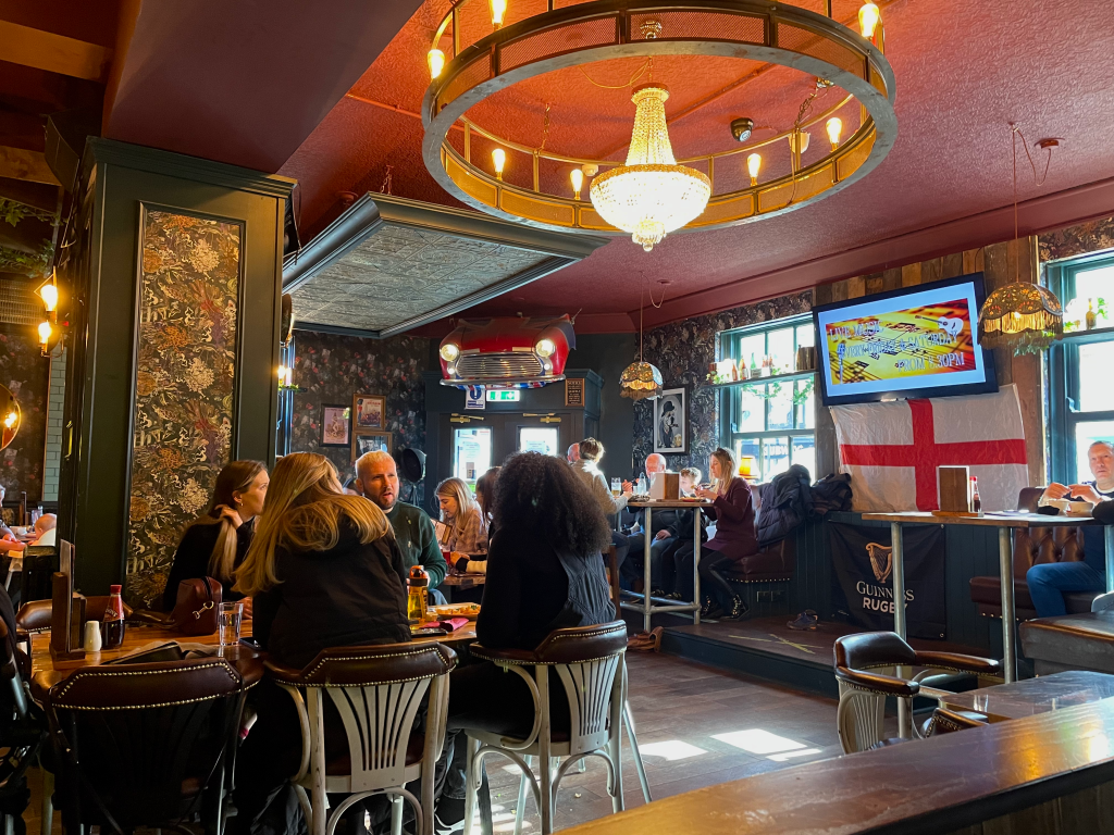 Pubs have a pleasant, low-key sort of ambience — locals (some accompanied by their dogs) sit around dimly-lit tables, their background chatter contributing to the warm, convivial atmosphere. A handful of TVs cycle through an assortment of quintessentially British (and largely alcohol-related) jokes, as well as an occasional advert for the weekly pub quiz.