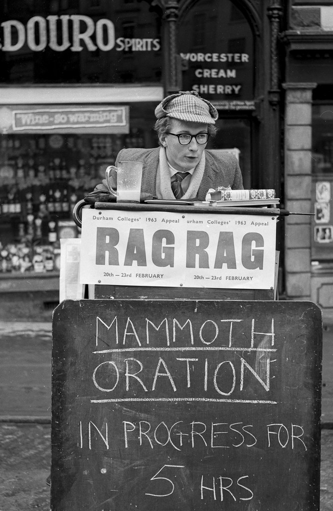 Peter Newing was an established expert in campanology, a former RAF man, tough as old boots though he didn’t look it. He was one of nature’s antiquarians, and became the Revered Doctor Newing during his time in the West Country. I can’t put a name to my image, though I think his first name was Bert: his parents wanted a picture. Rag Week always inspired daft activities: this young man was a year below me, but his name has been lost in time. He did a 24-hour oration for Rag charity.