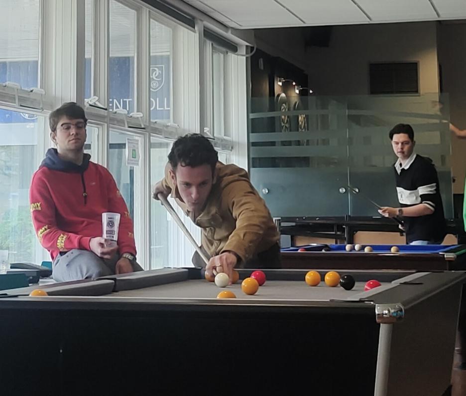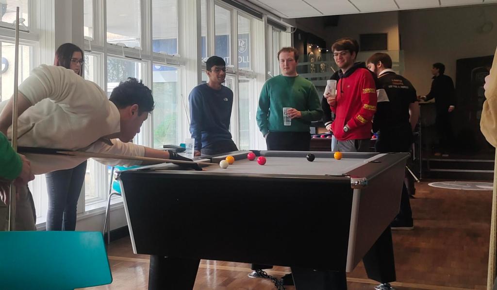 Usually the team mostly play in the Bailey’s room and sometimes at Kitt’s Pool Bar in town (to be accustomed to all table conditions; newer tables are usually more responsive). We also have some practice from our weekly matches against other colleges in Durham. Luckily the table at the competition site in York was a happy medium between the old one in Bailey’s room and the extremely smooth ones in Kitts, but a little smaller than John’s, which makes it slightly easier to cue.