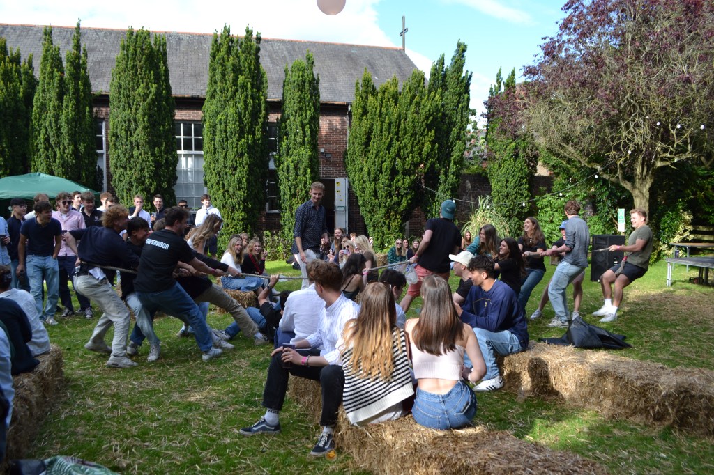 In addition to the taps, Johnians were encouraged to chat with friends on familiar hay bales and listen to live music. The Bar Team decided to host a rousing tug-of-war, a highlight of the event, between first Freshers and upper years and then guys vs girls. The girls quickly managed to win, forcing all the guys on the lawn to chop their pints in defeat. Many students found this to be the highlight of the event, with another student commenting how it was “quite fun to watch” and agreeing that the upper-year guys “really got outplayed”. As the night went on and more drinks were consumed, students used the pizza stand set up on the Bailey, offering homemade pizza for about £8. The presence of food only encouraged students to drink even more, with one student deciding that the peach ale became a popular runner up to the mysterious mango ale.