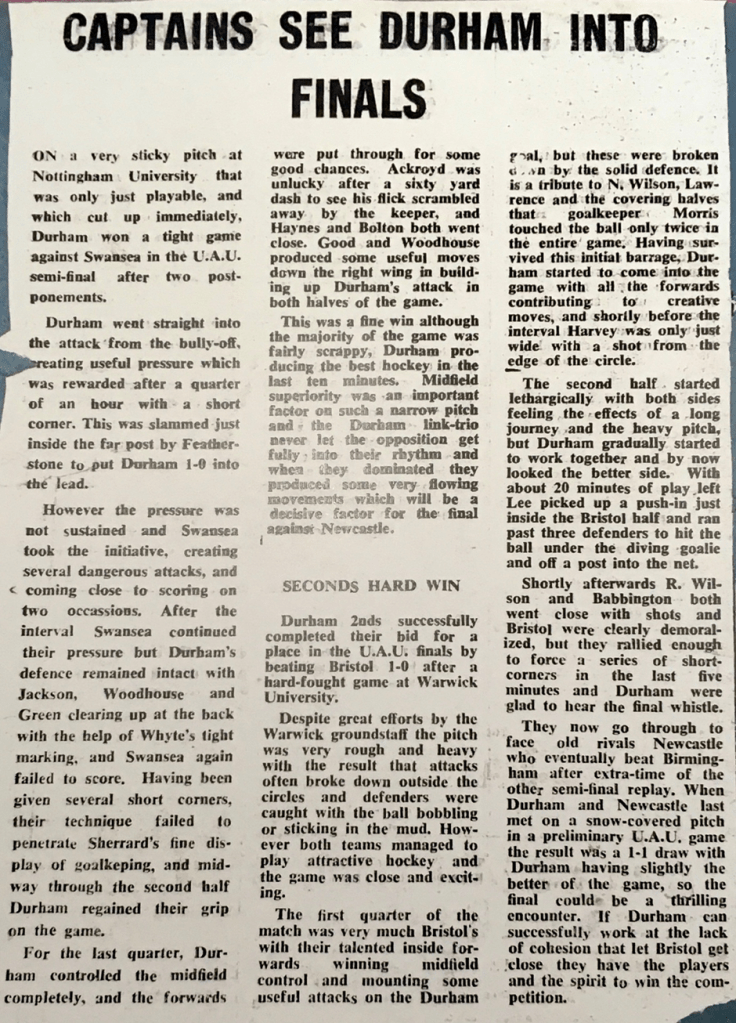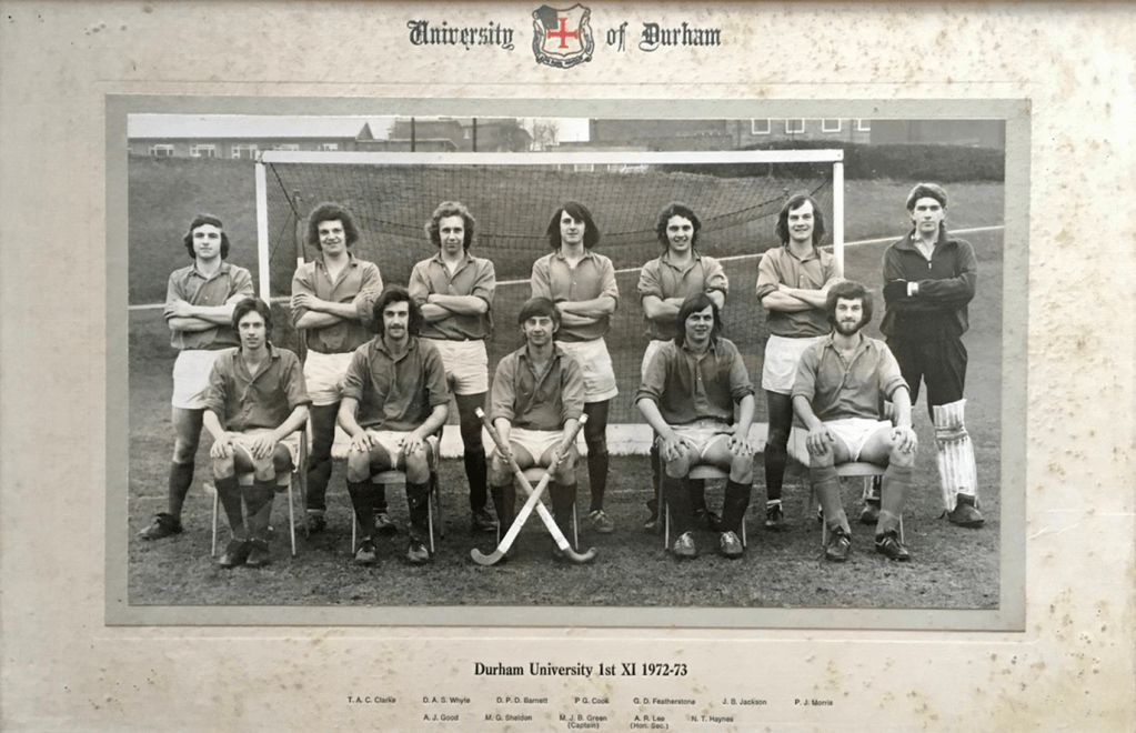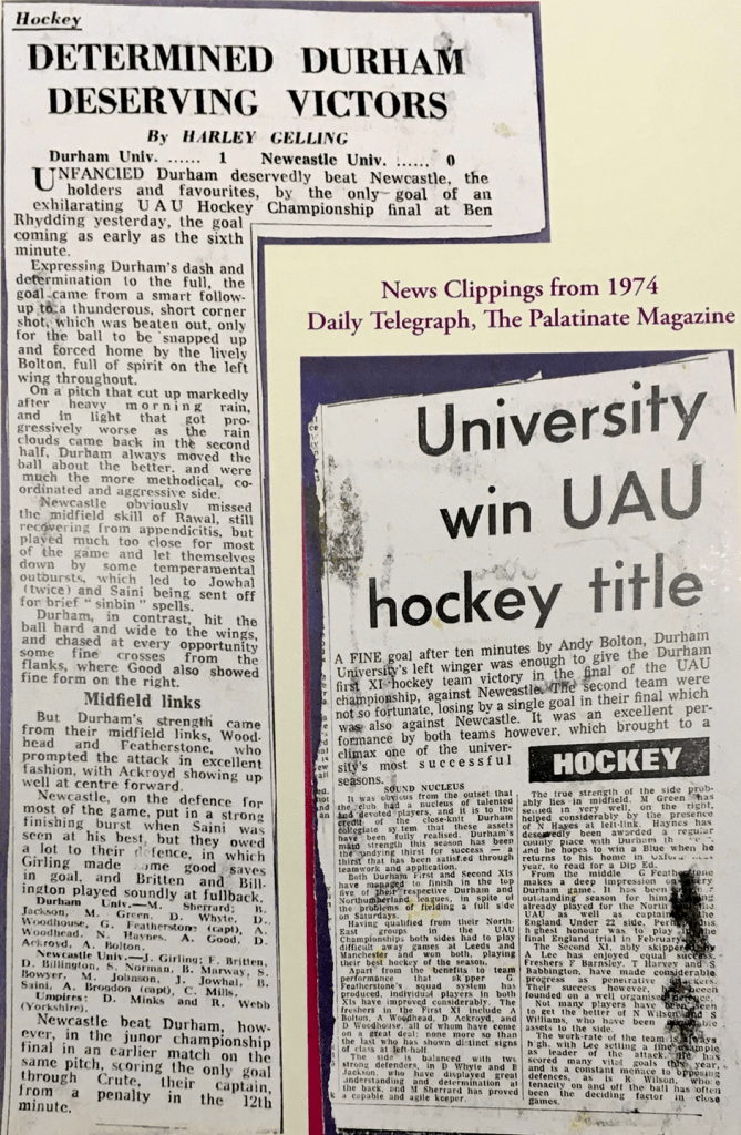 I played for the University’s 1st XI all three years, captaining in my 2nd year when we were joined by Gavin Featherstone, an England schoolboy international player who not only captained the team in my 3rd year (1973-74) but also convinced us that we could win the UAU (now BUCS) championship. We did so by a single goal secured in the first 10 minutes of the match! My abiding memory was the sodden pitch that was to our advantage as Newcastle was largely reliant on its two England forwards of South Asian heritage. Their stickwork was totally mesmerising but unfortunately the ball got stuck in the mud increasingly as the game proceeded! DU’s 2nd XI, captained by another John’s palatinate, Ant Lee, were also in the finals against Newcastle but they lost by a single goal. (Refer to the clippings for more details of the games.)
