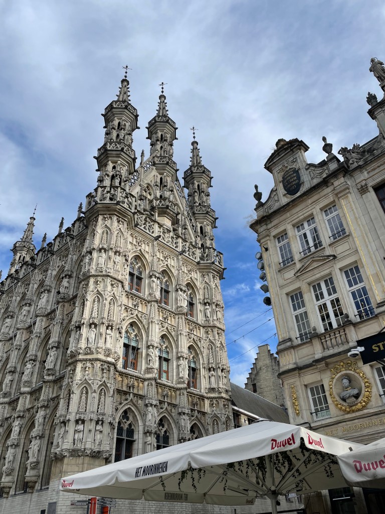 At noon on a balmy summer’s day, I stepped off the double-decker train onto the station platform in Leuven, Belgium. The station has a fabulous metal roof with inter-crossed metal beams sprawling in huge arches over the platforms, and through the gaps in these beams, sunlight poured, striping the platform with bright bands of light.