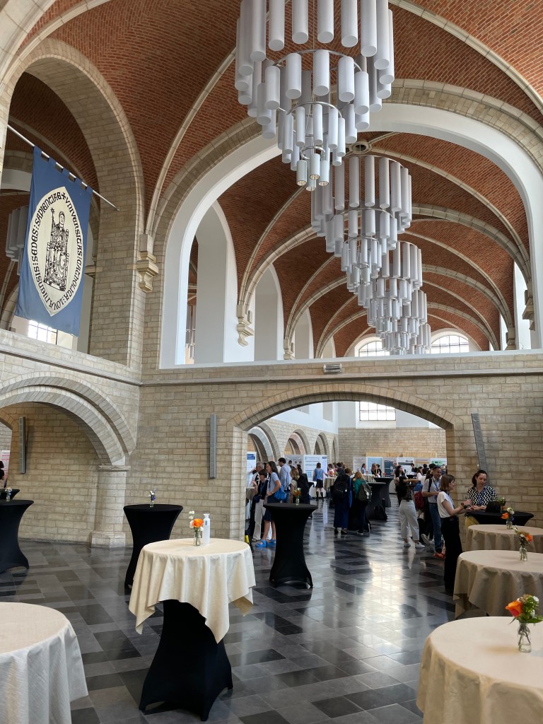 When the research poster session began the following day, I pinned my A0 glossy poster up in the historic Jubilee Hall amongst around seventy other research posters. Before long, the hall filled with conference guests swarming around the posters, interested in hearing about everyone’s research. Ideas were shared between visitors from the UK, USA, France, Norway, and Italy, just as they would have been six hundred years ago by the first students at KU Leuven.