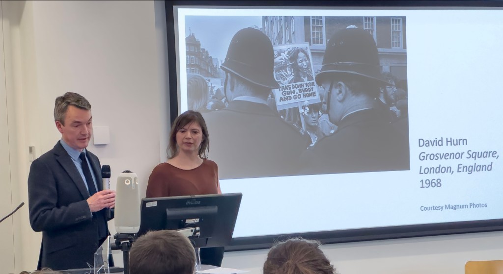 Firstly, Dr. Tom Allbeson, Reader in Media and Photographic History at the University of Cardiff, discussed his chapter Publishing for Peace: Newsworthiness, Authorship and Photobooks of the Vietnam Era. One photograph which I have attached above, on David Hurn’s photograph of protests in Grosvenor Square, has very deliberate positioning, wherein placing an image within another can alter its reception. In this context, press images were recontextualised in countercultural publications to instil radicalism. He expanded on how such images, once produced to serve the mainstream press, were later adopted and transformed by anti-war movements to challenge dominant viewpoints.