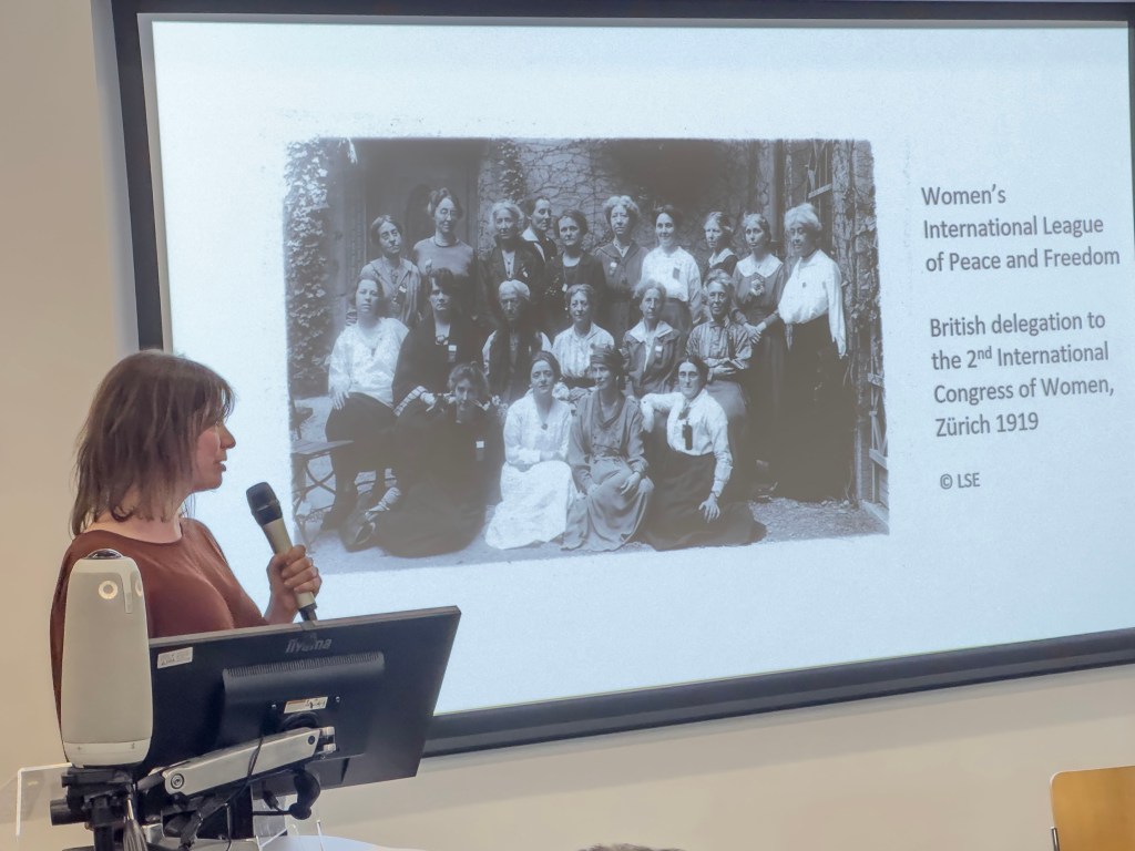 Then, Dr. Pippa Oldfield, a photography curator, historian of photography, and academic at Teesside University, presented her chapter Gender at the Peace Table: Photographic Visualisations of Peacemaking in the First World War. She examined how early 20th-century photographs framed women’s involvement in peace negotiations during and after the First World War, as well as the lasting impact of these depictions on contemporary diplomacy. By bringing attention to archival images of women in impactive positions following World War I, notably the photograph of the British delegation at the 2nd International Congress of Women, it was interesting to hear about how visual culture can either obscure or illuminate the roles played by different social groups.