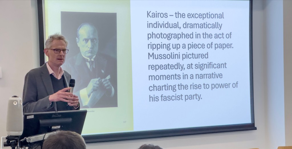 After this, Prof. Jonathan Long, Professor of German and Visual Culture here at Durham, explored Peace and its Discontents: Right-Wing Visions of Peace in the Weimar Republic. He introduced the philosophical concepts of Kairos and Chronos to illustrate competing states – one as an opportune moment (Kairos), the other as an extended process (Chronos), with historical photographic archives representing these. He described Chronos as representing a ‘humanly uninteresting time’ – a period of parliamentary politics marked by the repetitive imagery of men in suits. In contrast, Kairos was depicted as the moment of rupture, exemplified in images of Mussolini dramatically tearing up these photographs, positioning himself as disrupting the ‘stagnation’ of Chronos and leading the Fascist Party into power.