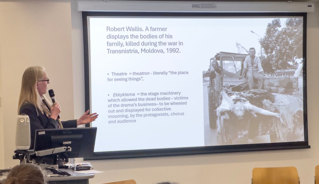 Finally, Dr. Jennifer Wallace, Director of Studies in English at Peterhouse College, Cambridge, discussed Tragedy, Recognition and Photography: Affective Traditions of Witnessing. She explored the ways in which photography functions as a modern extension of ancient theatrical traditions of witnessing. The concept of theatron – literally meaning ‘the place for seeing’ – formed the basis of the idea that photographs, like theatre, invite audiences to bear witness to suffering and, in doing so, shape collective emotional responses. She also introduced the ekklyklema, a stage mechanism used in Greek drama to wheel out the bodies of the dead, drawing a direct comparison to the way war photography confronts audiences with the visual reality of violence.