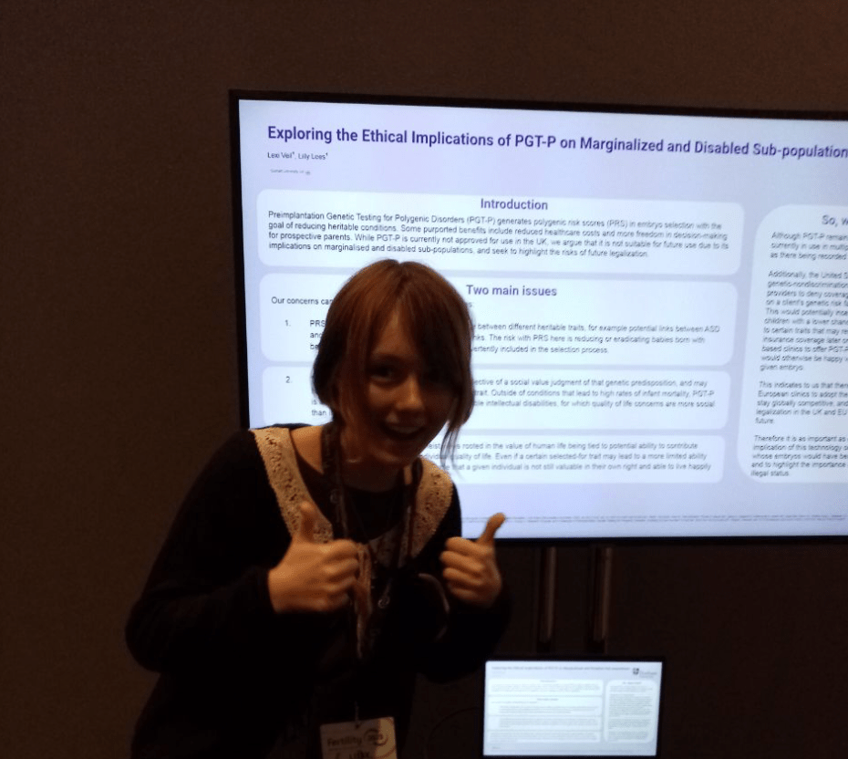 Hello, I’m Lilly, a second-year undergraduate studying Computer Science and Philosophy from St. John’s. Over the summer, a fellow student and I co-authored an abstract exploring the ethical implications of Polygenic Embryo Screening (PGT-P) for disabled and marginalised communities. Although neither of us has a biology background, we are both fascinated by the bioethics of IVF, especially given its increased commercialisation, and felt like we wanted to contribute to the critical discussion around genetic testing.